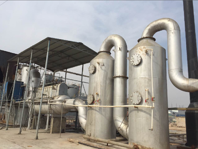 廢液和壓縮空氣經(jīng)管路控制系統(tǒng)進(jìn)入霧化系統(tǒng),廢液霧化后噴入燃燒室,并依次通過迷宮除塵室和二次燃燒室,廢液中的有機(jī)物被焚燒,水分被蒸發(fā)。焚燒產(chǎn)生的高溫?zé)煔膺M(jìn)入空氣換熱器,然后依次通過兩級(jí)急冷、吸附塔,煙氣中的微小粉塵及有害物質(zhì)(SO2、HCl等)被捕集吸收,經(jīng)處理后的干凈氣體由引風(fēng)機(jī)引入煙囪,排入大氣。